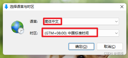3.点击安装程序之后,会提示选择语言和时区,我们选择“简体中文”和“GTM+8:00中国标准时间”,点击“确定”,进行下一步操作。