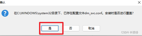 10.如果提示dm_svc.conf已经存在,直接点击“是”进行覆盖即可。