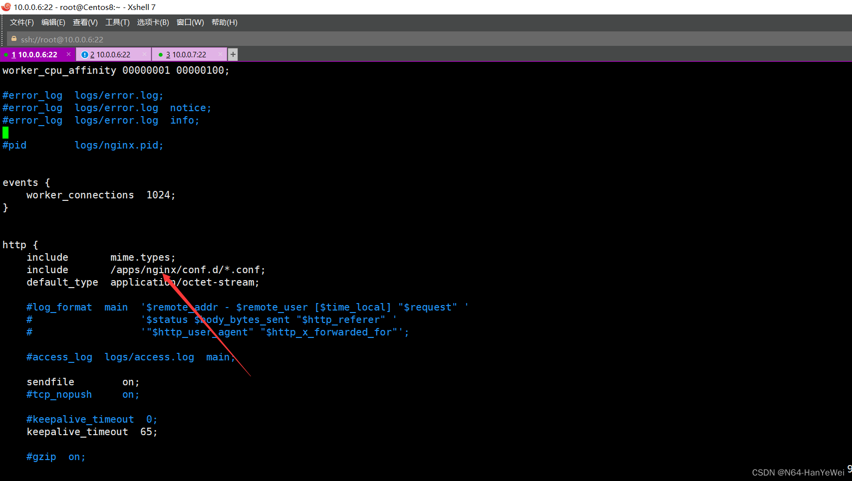 include /apps/nginx/conf/conf.d/*.conf; #在配置文件的最后面添加此行,注意不要放在最前