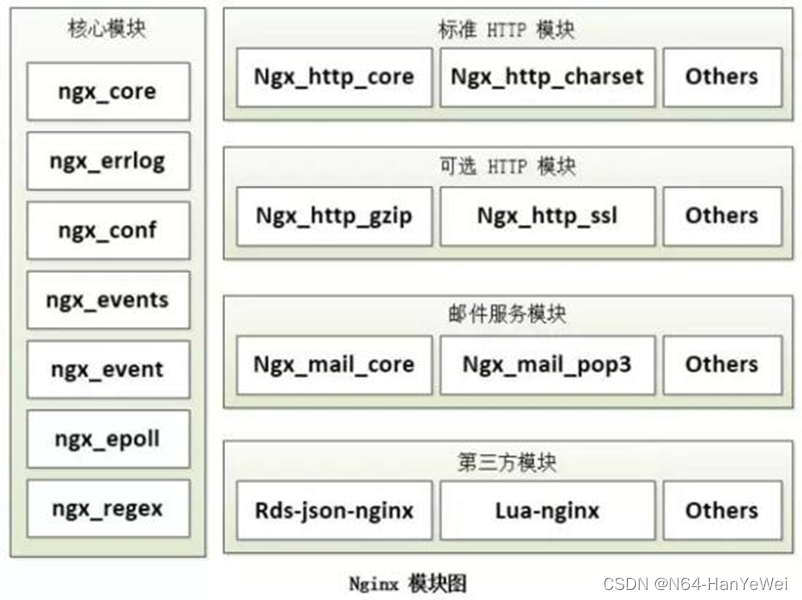 第三方模块:是为了扩展 Nginx 服务器应用,完成开发者自定义功能,比如: Json 支持、 Lua 支