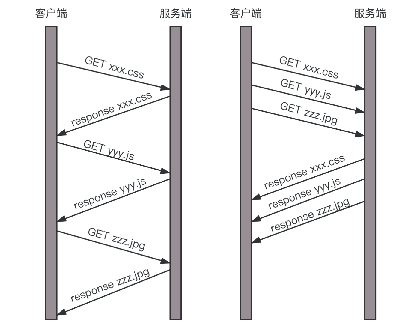 我们来举一个例子。假设我们的一个页面要发送三个独立的请求,一个获取 css,一个获取 js,一个获取图片 jpg。如果使用 HTTP 1.1 就是串行的,但是如果使用 HTTP 2.0,就可以在一个连接里,客户端和服务端都可以同时发送多个请求或回应,而且不用按照顺序一对一对应。