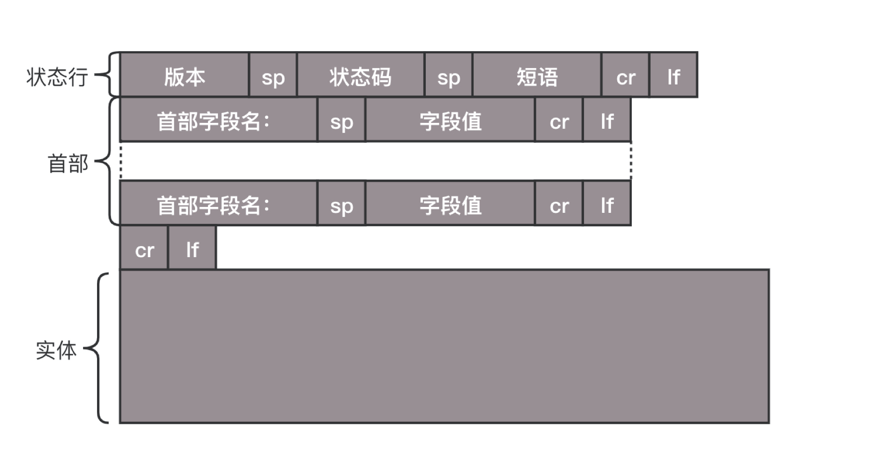 看结构图会发现结构跟请求的结构差不多,请求行换成了状态行,状态码会反映 HTTP 请求的结果。“200”意味着大吉大利今晚吃鸡;而我们最不想见的,可能就是“404”,也就是“服务端无法响应这个请求”。然后,短语会大概说一下原因。