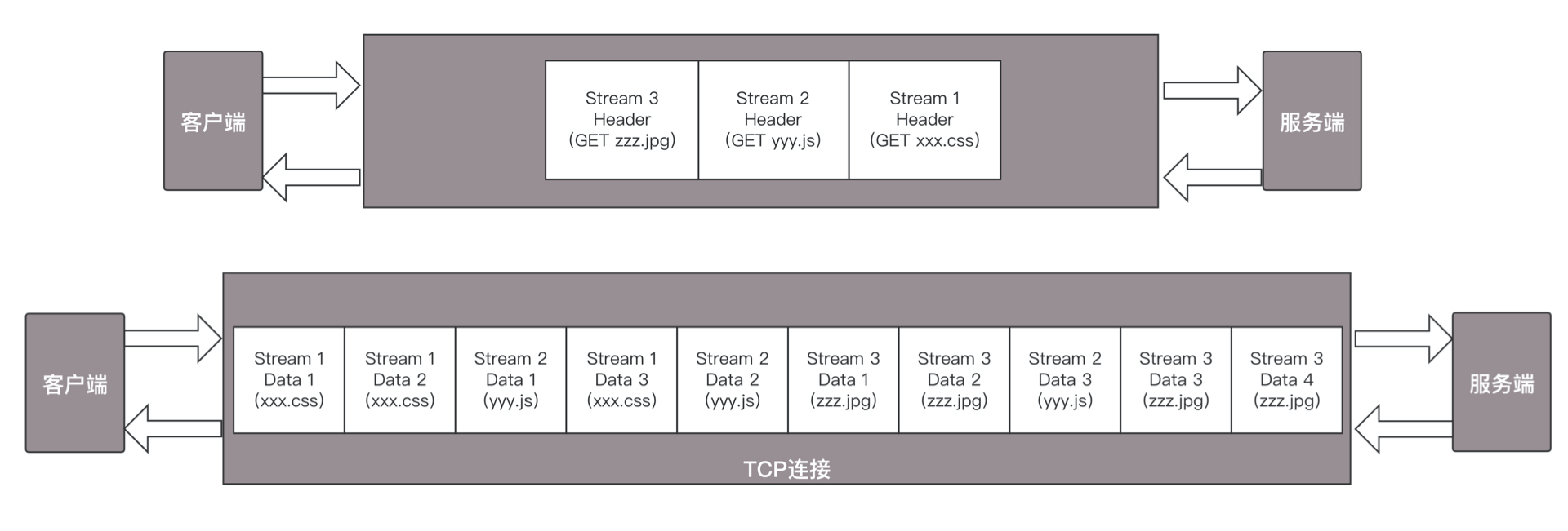 HTTP 2.0 其实是将三个请求变成三个流,将数据分成帧,乱序发送到一个 TCP 连接中。