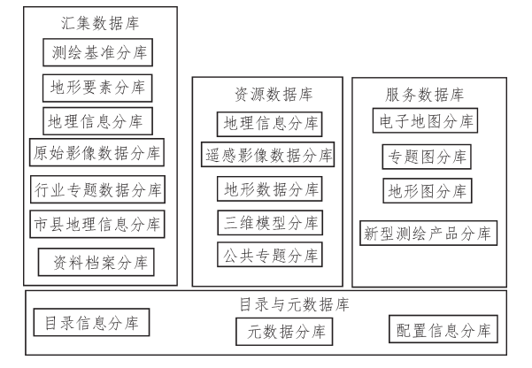 数据资源系统是信息时空大数据中心建设的重点。时空数据中心的数据资源主要有 4 个部分:汇聚数据库、资源数据库、服务数据库、目录数据库和元数据库。