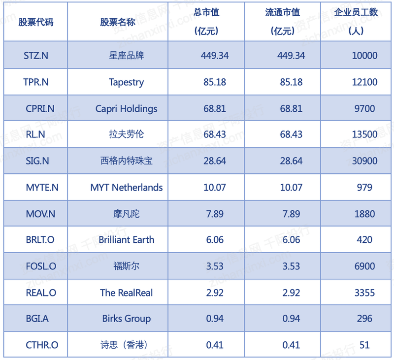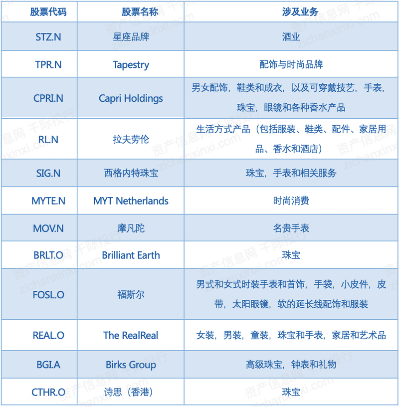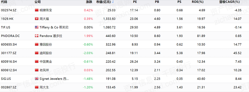 非中国上市公司有Tiffany & Co 蒂芙尼[TIF.N]、Pandora 潘多拉[PNDORA.DC]、Signet Jewelers 西格内特珠宝[SIG.N]、Rajesh Exports 拉夫劳伦[RL.N]等。