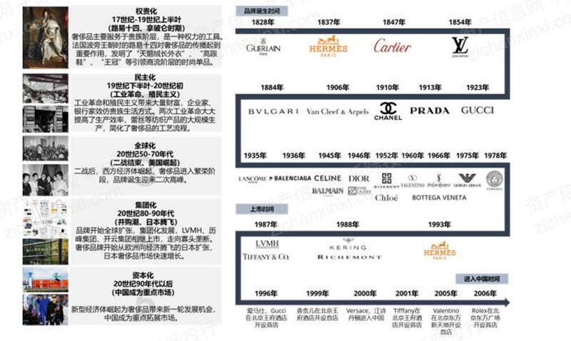 奢侈品品牌17世纪诞生。17世纪-19世纪上半叶,奢侈品主要服务于贵族阶层,是一种权力的工具。19世纪下半叶,奢侈品逐渐民主化。工业革命和殖民主义带来大量财富,企业家、银行家开始效仿贵族的生活方式。两次工业革命提升了奢侈品的生产效率。