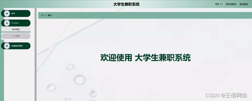 3、主页内容管理:管理员登录以后,可以对个人中心、学生管理、企业管理、兼职信息管理、投递简历管理、就业指南管理、交流论坛、系统管理进行详细操作。