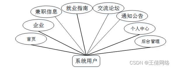(2)系统用户模块中的用户角色是学生和企业,学生和企业可以实现首页、企业、兼职信息、就业指南、交流论坛、通知公告、个人中心、后台管理等功能,系统用户模块用例图如图3-2所示。