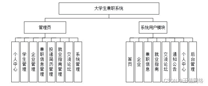 大学生兼职系统主要有三类用户,分别是系统用户模块中的学生和企业,管理员模块中的管理员,详细规划如图4-1所示。
