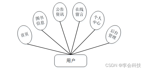 用户进入系统主要实现首页,图书信息,公告资讯,在线留言,个人中心,后台管理等功能。用户用例图如图3-2所示。