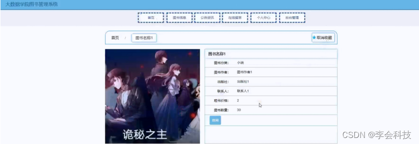 图书信息,在图书信息页面可以查看图书名称,图书分类,图书作者,出版社,联系人,租书价格,图书数量等内容,并进行借阅和收藏等操作,如图5-2所示。