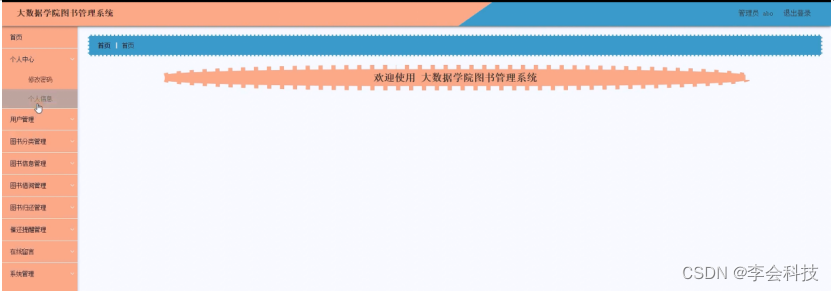 管理员登录系统后,可以对首页、个人中心、用户管理、图书分类管理、图书信息管理、图书借阅管理、图书归还管理、催还提醒管理、在线留言、系统管理等功能进行相应的操作管理,如图5-5所示。