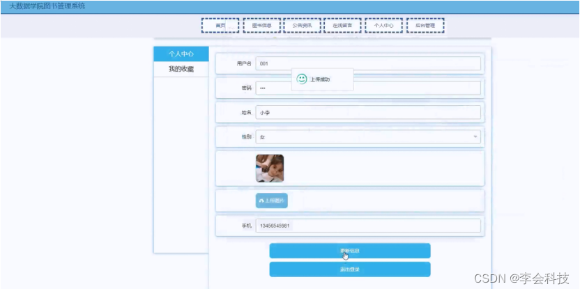 个人中心,在个人中心页面通过填写个人用户名、密码、姓名、性别、上传图片、手机等内容进行更新信息操作,还可以对我的收藏进行操作,如图5-3所示。