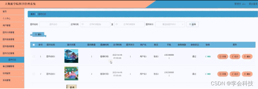 图书归还管理,在图书归还管理页面可以对索引,图书名称,图书封面,图书数量,借阅时间,还书时间,图书评分,用户名,姓名,手机,审核回复,审核状态,审核等内容进行详情,修改和删除操作,如图5-10所示。