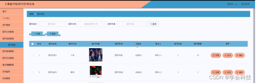 图书信息管理,在图书信息管理页面可以对索引,图书名称,图书分类,图书封面,图书作者,出版社,联系人,租书价格,图书数量等内容进行详情,修改和删除操作,如图5-8所示。