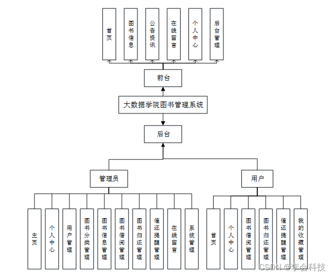 系统设计是把本系统的各项功能需求进行细化,而转换为软件系统表示的一个设计过程,在对目标系统的研究分析之后,做出整个系统平台的总体规划,进而对用例中各个对象进一步地合理精细设计。为降低整个系统的复杂度,而使其更加便于修改,提高代码的可读性,我们会将系统模块化,模块间保持相对独立,且每个模块只完成一个子功能,并且与其他模块通过简单的接口链接,即高内聚低耦合原则,而使整个系统能够拥有一个高性能的结构,这边是系统概要设计最重要的目的。在之前的需求分析的基础上,大数据学院图书管理系统结构,如下图4-1所示。