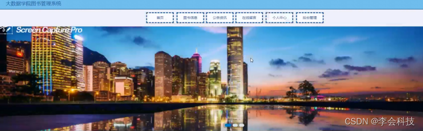 学院图书管理系统,在系统首页可以查看首页、图书信息、公告资讯、在线留言、个人中心、后台管理等内容,并进行详细操作;如图5-1所示。