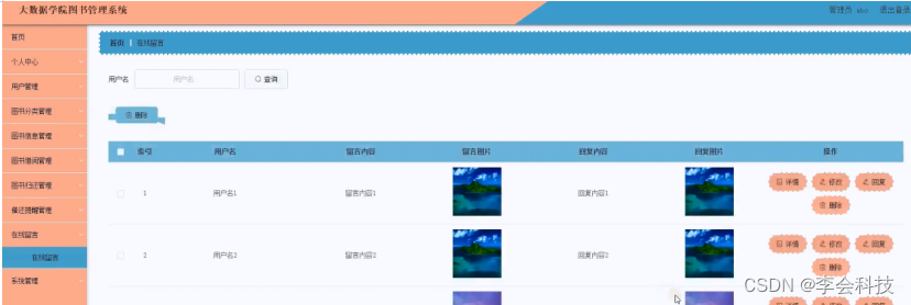 在线留言,在在线留言管理页面可以对索引,用户名,留言内容,留言图片,回复内容,回复图片等内容进行详情,修改,回复和删除等操作;如图5-11所示。