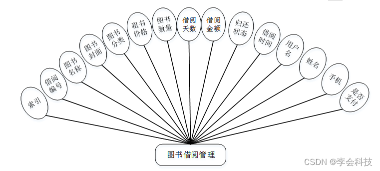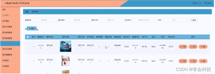 图书借阅管理,在图书借阅管理页面可以对索引,借阅单号,图书名称,图书封面,图书分类,租书价格,图书数量,借阅天数,借阅金额,归还状态,借阅时间,用户名,姓名,手机,是否支付等内容进行详情,修改和删除操作,如图5-9所示。