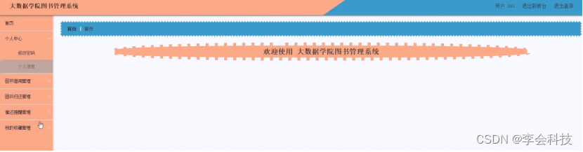 用户登录进入系统可以对首页,个人中心,图书借阅管理,图书归还管理,催还提醒管理,我的收藏管理等功能进行相应操作,如图5-12所示。