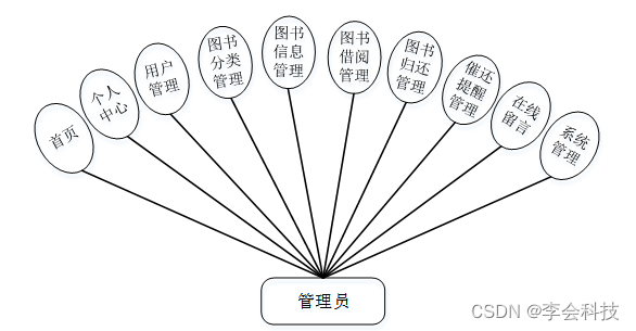 管理员登陆后,主要模块包括首页、个人中心、用户管理、图书分类管理、图书信息管理、图书借阅管理、图书归还管理、催还提醒管理、在线留言、系统管理等功能。管理员用例图如图3-1所示。