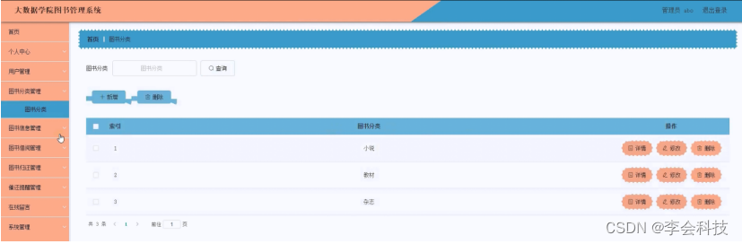 图书分类管理,在图书分类管理页面可以对索引,图书分类等信息进行详情,修改和删除操作,如图5-7所示。