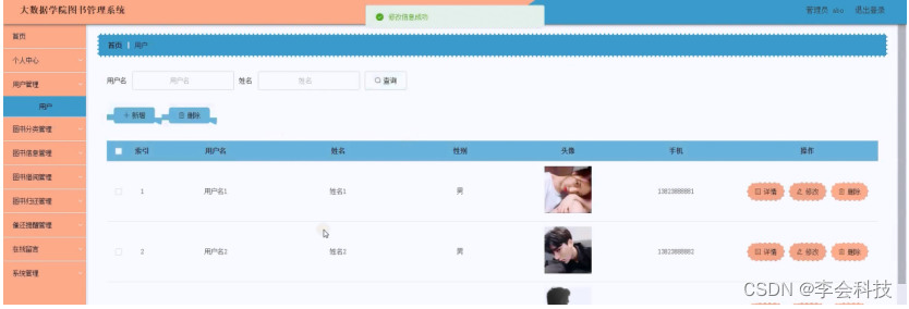 用户管理,在用户管理页面可以对索引,用户名,姓名,性别,头像,手机等内容进行详情,修改和删除操作,如图5-6所示。