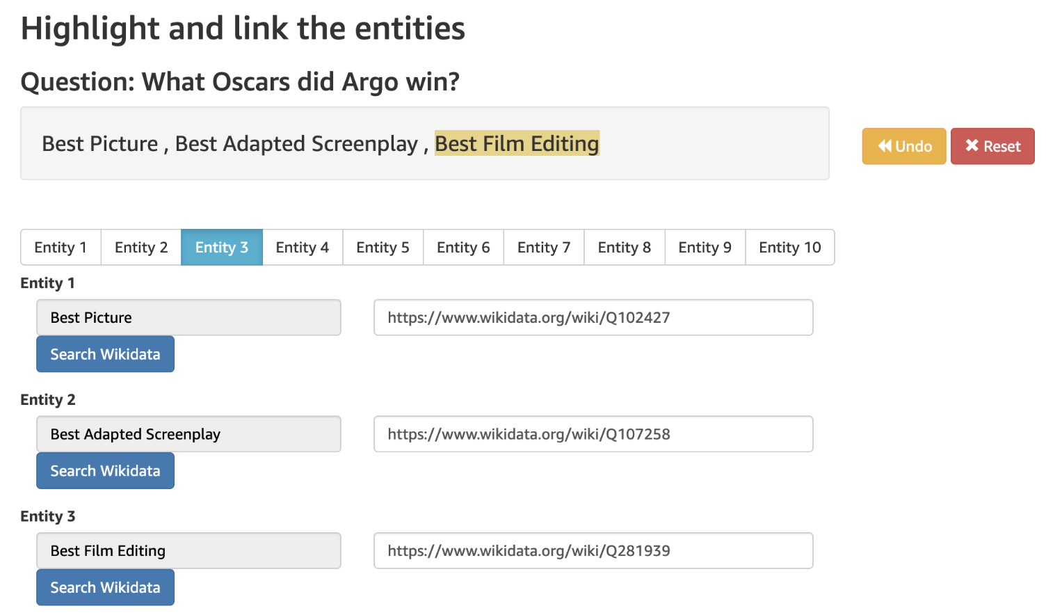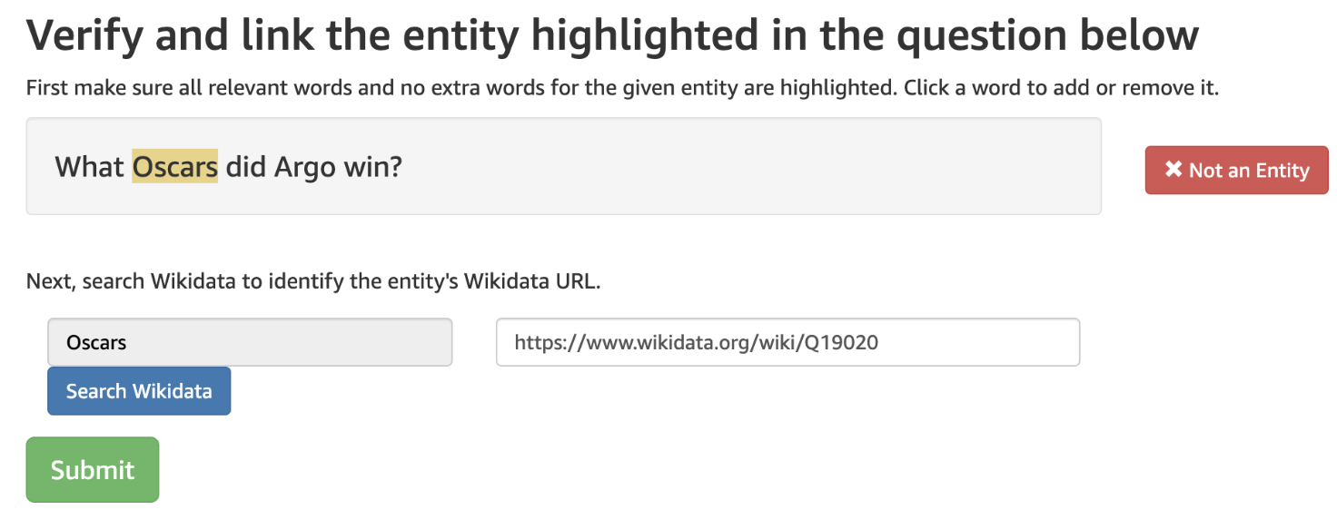 论文摘要:我们介绍了Mintaka,这是一个复杂的、自然的、多语言的数据集,旨在实验端到端问题回答模型。Mintaka由20,000个问题-答案对组成,这些问题-答案对以英语收集,并以Wikidata实体作为注释,然后翻译成阿拉伯语、法语、德语、印地语、意大利语、日语、葡萄牙语和西班牙语,共18万个样本。Mintaka包括8种类型的复杂问题,包括超限、交叉和多跳问题,这些问题是由人群工作者自然引出的。我们在Mintaka上运行基线,其中最好的是英语达到38%的top1命中率,多语种达到31%的top1命中率,表明现有模型有改进的余地。我们将Mintaka发布在 https://github.com/amazon-research/mintaka