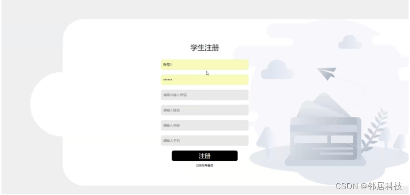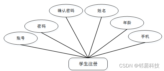 学生注册,在学生注册页面通过填写账号、密码、确认密码、姓名、年龄、手机等信息完成注册操作,如图5-4所示。