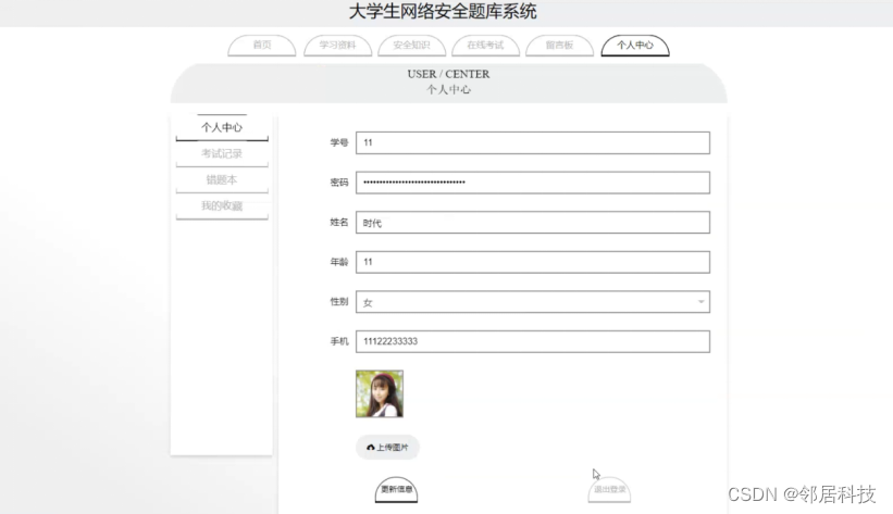 个人中心,在个人中心页面通过填写学号、密码、姓名、年龄、性别、手机、上传图片等内容进行更新信息,根据需要对考试记录,错题本,我的收藏进行相对应操作,如图5-5所示。