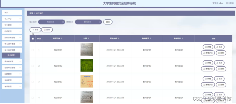 安全知识管理,在安全知识管理页面可以对索引、知识名称、封面、发布时间、教师账号、教师姓名等内容进行详情,修改,查看评论和删除等操作,如图5-12所示。