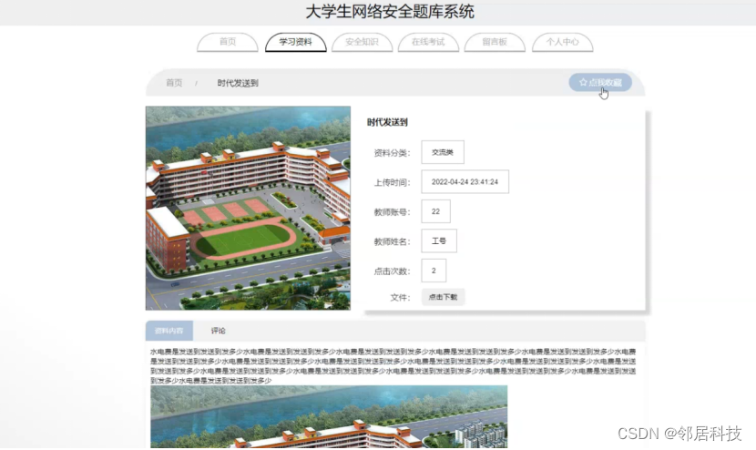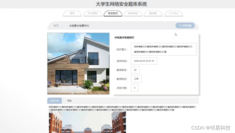 安全知识,在安全知识页面可以知识封面、知识名称、知识简介、发布时间、教师账号、教师姓名、点击次数、知识内容等详细内容,并进行评论或收藏操作,如图5-2所示。