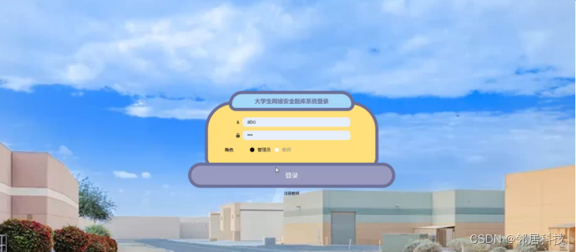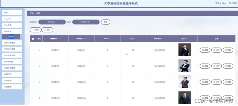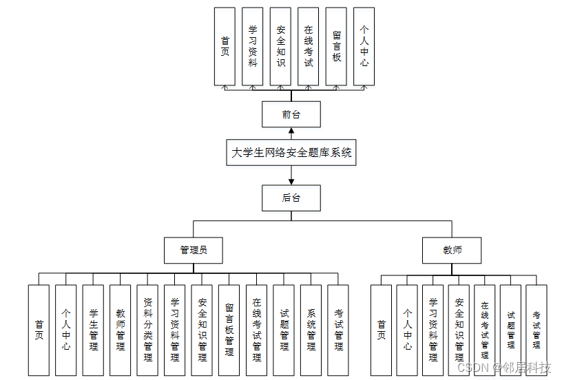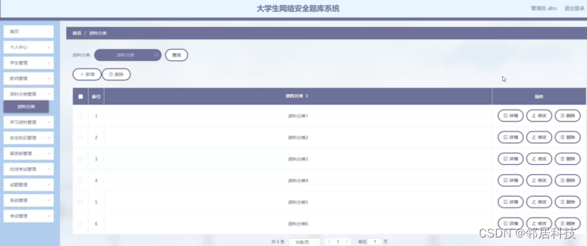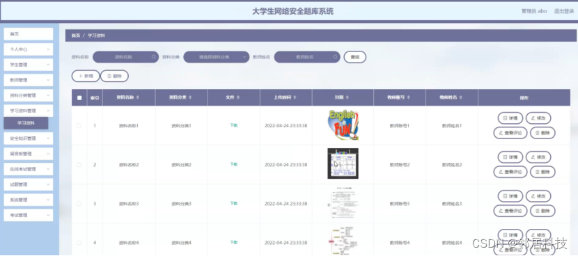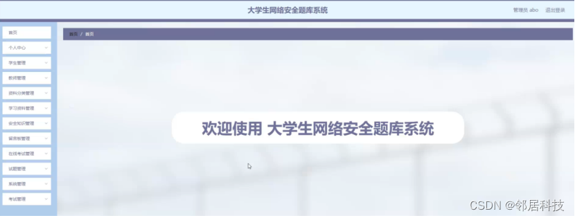 大学生网络安全题库系统提供管理员、教师和学生三个用户角色,主要包括首页、个人中心、学生管理、教师管理、资料分类管理、学习资料管理、安全知识管理、留言板管理、在线考试管理、试题管理、系统管理、考试管理等功能。