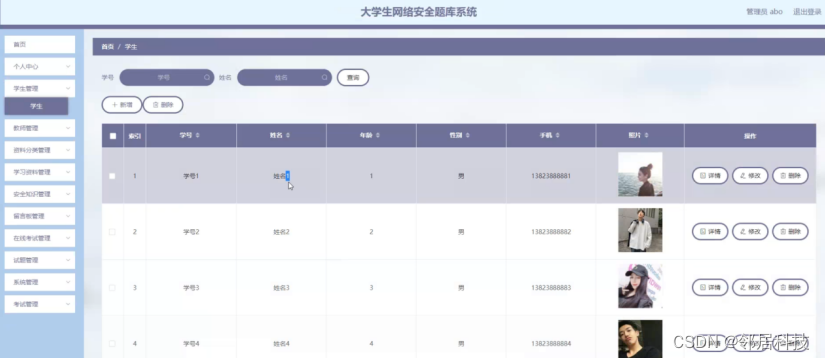 学生管理,在学生管理页面可以对索引、学号、姓名、年龄、性别、手机、照片等内容进行详情,修改和删除等操作,如图5-8所示。