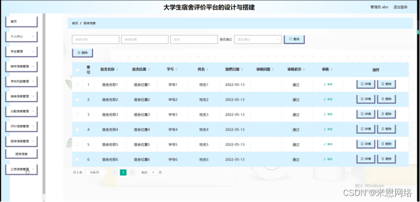 报修信息管理;在报修信息管理页面中可以对索引、宿舍名称、宿舍位置、学号、姓名、报修日期、审核回复、审核状态、审核等内容进行详情、删除操作;如图4-9所示。