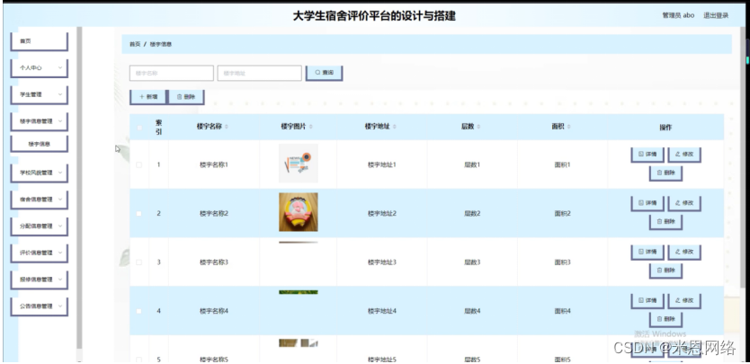 楼宇信息管理;在楼宇信息管理页面中可以对索引、楼宇名称、楼宇图片、楼宇地址、层数、面积等内容进行详情,修改和删除操作;如图4-8所示。