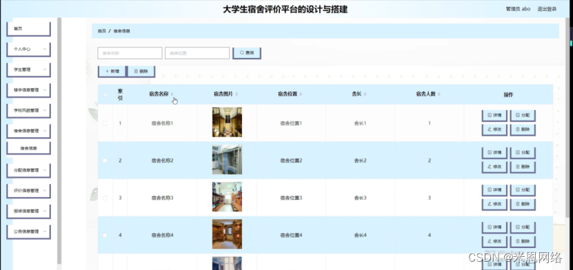 宿舍信息管理;在宿舍信息管理页面中可以对索引、宿舍名称、宿舍图片、宿舍位置、舍长、宿舍人数等内容进行详情、分配、修改和删除操作;如图4-6所示。