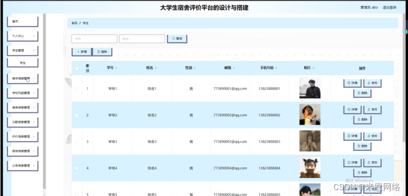 学生管理;在学生管理页面中可以对索引、学号、姓名、性别、邮箱、手机号码、相片等内容进行详情,修改和删除操作;如图4-3所示。