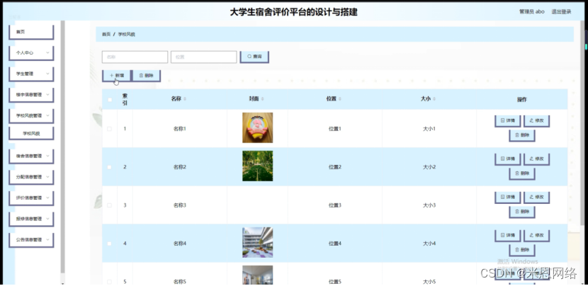 学校风貌管理;在学校风貌管理页面中可以对索引、名称、封面、位置、大小等内容进行详情、修改和删除操作;如图4-4所示。