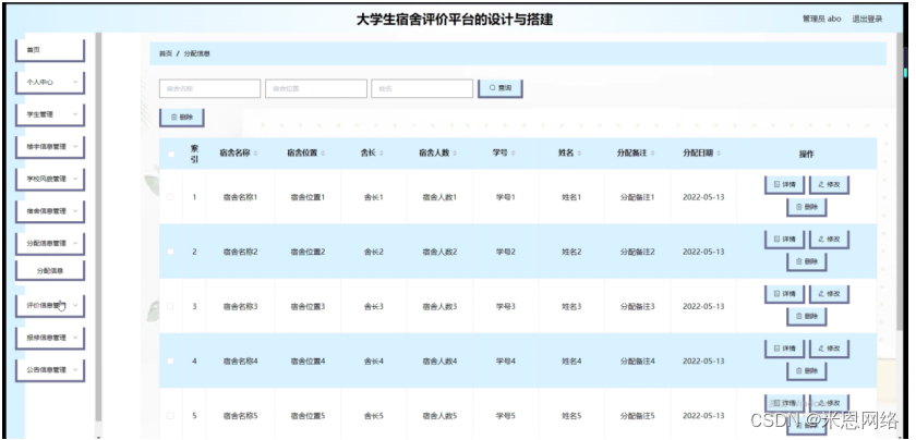 分配信息管理;在分配信息管理页面中可以对索引、宿舍名称、宿舍位置、舍长、宿舍人数、学号、姓名、分配备注、分配日期等内容进行详情、修改和删除操作;如图4-7所示。