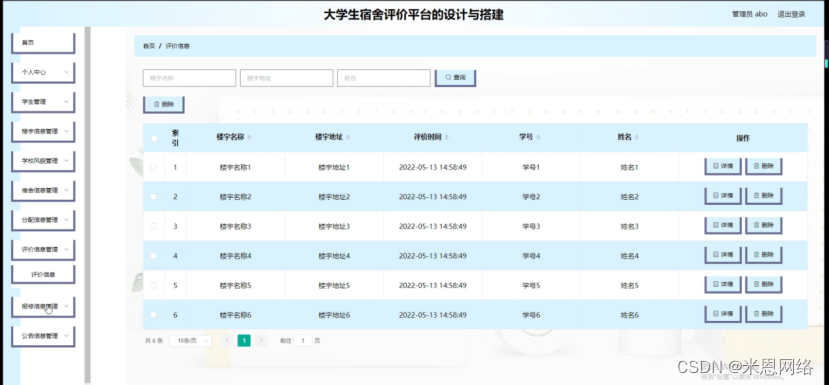 评价信息管理;在评价信息管理页面中可以对索引、楼宇名称、楼宇地址、评价时间、学号、姓名等内容进行详情和删除操作;如图4-8所示。