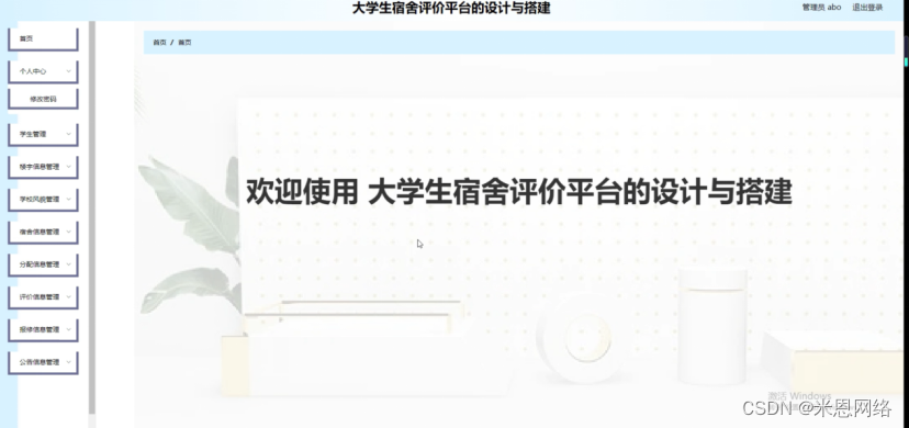 管理员登录进入系统可以查看首页、个人中心、学生管理、楼宇信息管理、学校风貌管理、宿舍信息管理、分配信息管理、评价信息管理、报修信息管理、公告信息管理等功能,并进行详细操作,如图4-2所示。