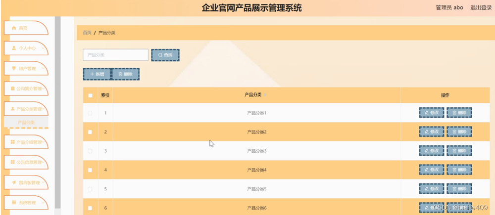 产品分类管理,在产品分类管理页面可以对索引,产品分类等信息进行修改和删除等操作,如图5-9所示。