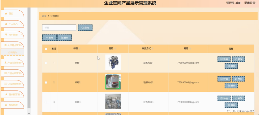 公司简介管理,在公司简介管理页面可以对索引,标题,图片,联系方式,邮箱等内容进行详情,修改和删除等操作,如图5-8所示。