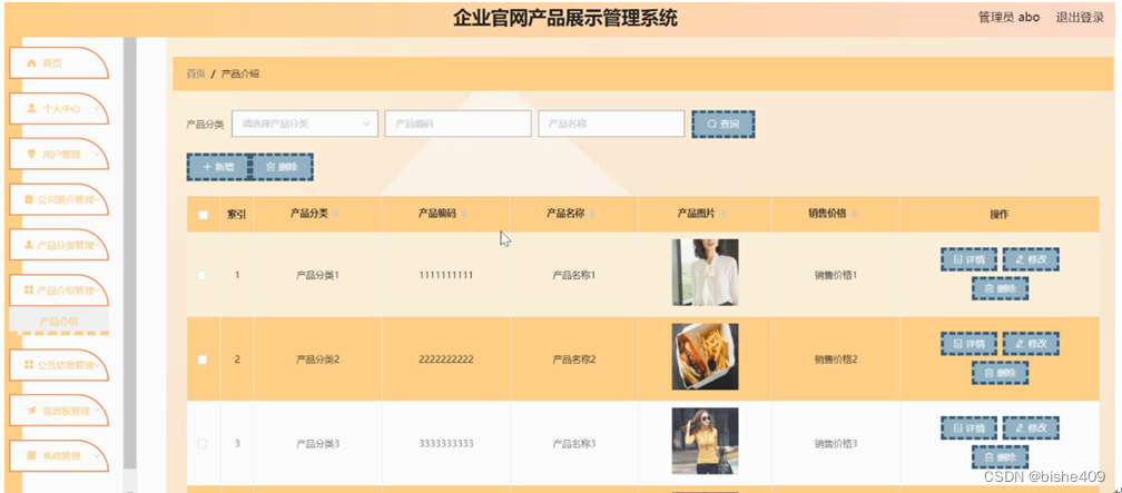 产品介绍管理,在产品介绍管理页面可以对索引,产品分类,产品编码,产品名称,产品图片,销售价格等内容进行详情,修改和删除等操作,如图5-10所示。
