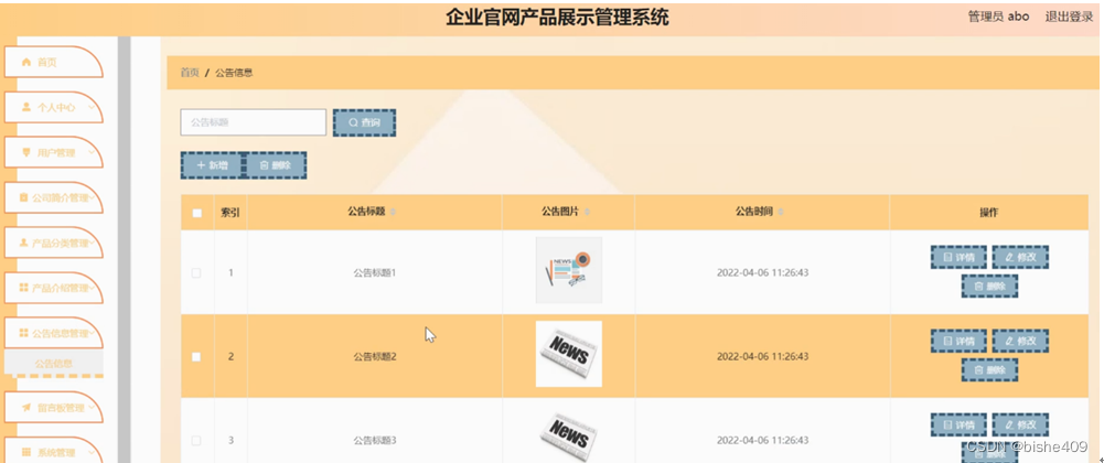 公告信息管理,在公告信息管理页面可以对索引,公告标题,公告图片,公告时间等内容进行详情,修改和删除等操作,如图5-11所示。