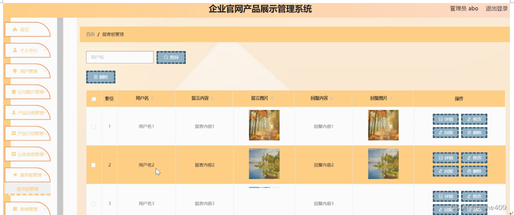 留言板管理,在留言板管理页面可以对索引,用户名,留言内容,留言图片,回复内容,回复图片等内容进行详情,修改,回复和删除等操作,如图5-12所示。
