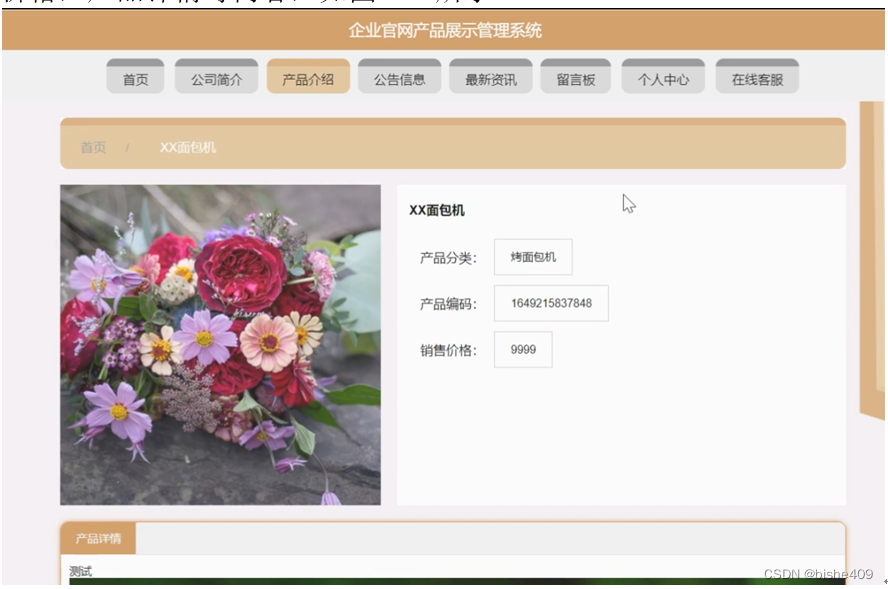 产品介绍,在产品介绍页面可以查看产品名称,产品分类,产品编码,图片,销售价格,产品详情等内容,如图5-2所示。