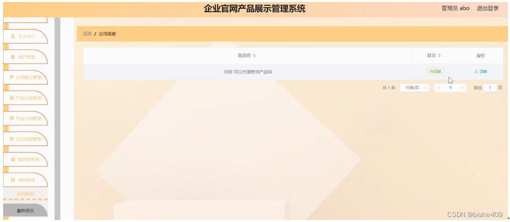 系统管理,在在线客服页面可以对新消息,状态等内容进行回复操作,还可以对最新资讯进行详细的操作管理;如图5-13所示。