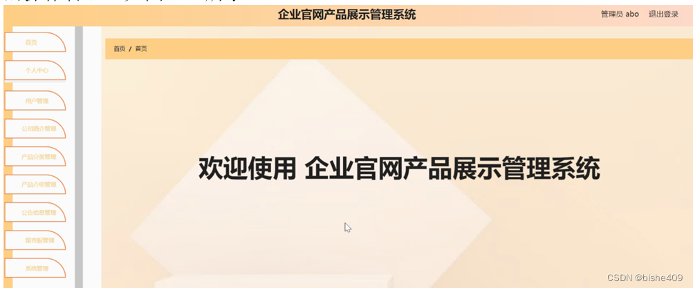 管理员登录系统后,可以对首页,个人中心,用户管理,公司简介管理,产品分类管理,产品介绍管理,公告信息管理,留言板管理,系统管理等功能进行相应的操作管理,如图5-6所示。